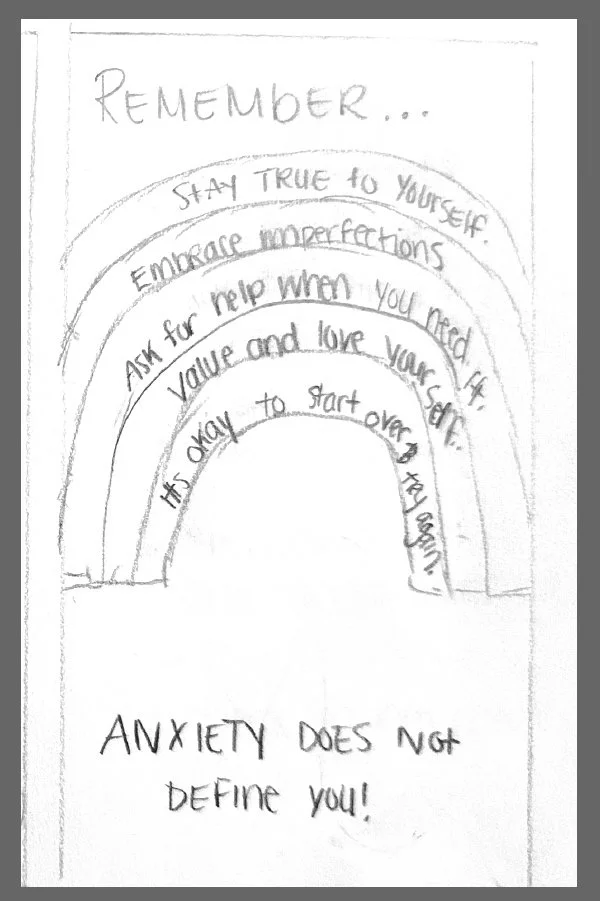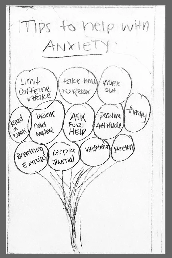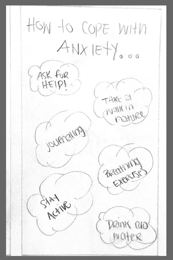 Initial Sketches to showcase my thought process from the beginning. I wanted to anxiety with illustrations showing what someone can be facing, how to help and how to manage anxiety.